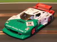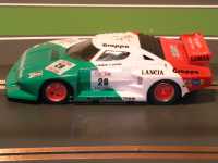 Da das Slotcar in der Gruppe 5 der Clubmeisterschaft des MSC Bischofsheim eingesetzt werden sollte, wurde als Karosserie diesesmal der Lancia Stratos Turbo von Tamiya gewählt. Denjenigen welche die Tamiya Karosserie kennen, wird auffallen, dass mein Lancia vorne sehr breit ist. Ihr habt Euch nicht getäuscht. Das Reglement lässt zu, das Fahrzeug bei Bedarf zu verbreitern. Dies habe ich auch gemacht, nur wesentlich aufwändiger als sonst üblich. Ich habe die vorderen originalen Kotflügelverbreiterungen entlang einer Kante incl. der Türschweller mit dem Dremel abgeschnitten und mit einem 0,5mm dickem Polystyrolblättchen, als Unterstützung von unten, 4mm weiter nach aussen wieder eingeklebt. Von oben habe ich in die entstandene Lücke (Nut) erstmal 4mm breite Polystyrol-Streifen eingeklebt und dann die restlichen Spalten mehrfach gespachelt und geschliffen. Als Decals kam aber auch nur Eigenbau in Frage, denn von dem Stratos gab es ja nicht so viele Varianten und die anderen sind im Club schon vertreten. Dieses Mal durfte ich auch mal wieder lackieren. ;-) Ist für meine dritte Lackierung schon ganz gut, aber auch hier auf jeden Fall noch ausbaufähig. Wie ich aber gerade gesehen habe, hat der Weißabgleich mal wieder nicht so richtig funktioniert, die Farben sind dadurch leider ein wenig verfälscht.
